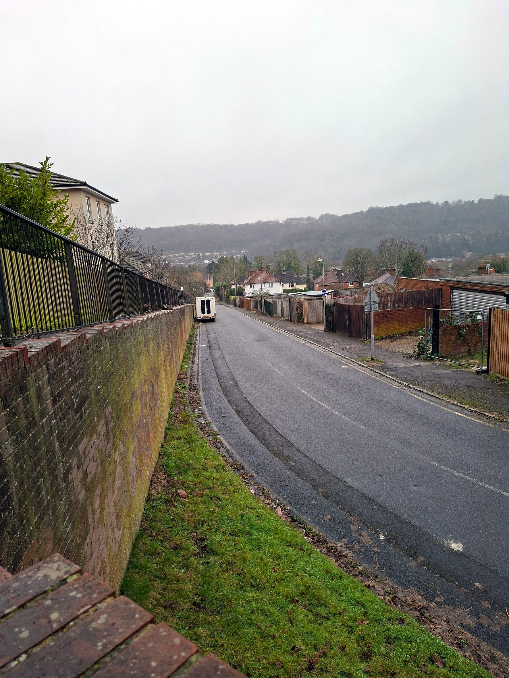 A place I want to describe for you is so completely unremarkable it’ll probably be quite dull, but bear with. An anonymous back street in a no-man’s land between urban districts, just a little too steep and too far out of the way to be a rat run. On one side, above a curtain of red brick and curb stones, a path behind railings raised 2 meters above the tarmac. On the other, a pavement running down past nothing but garage doors and fence panels bordering the long gardens that fall away so sharply the chimneys of the houses can’t even be seen from the high side of the road.